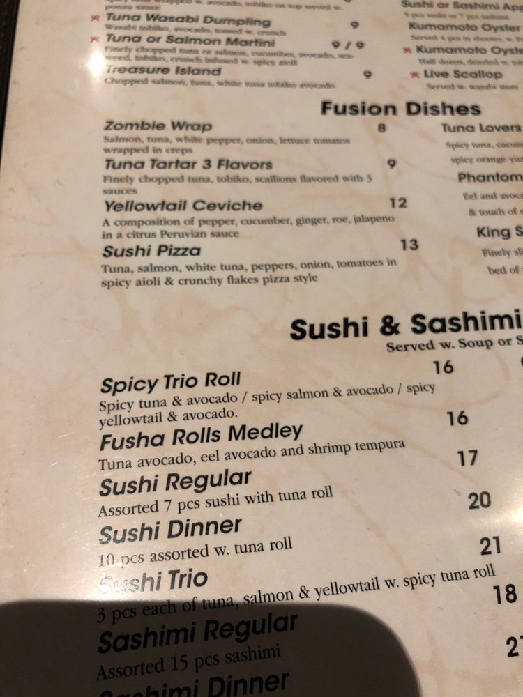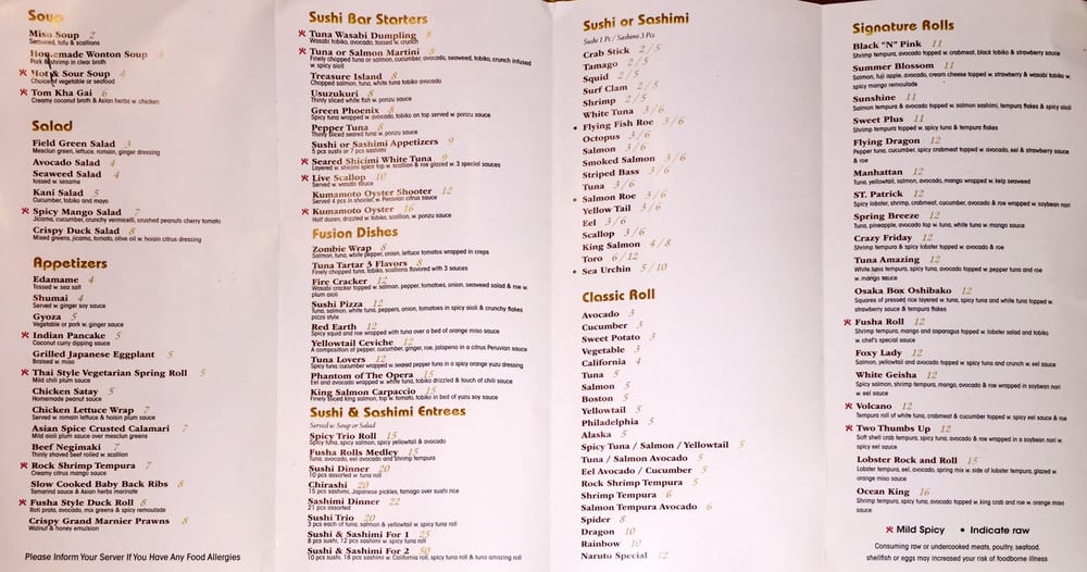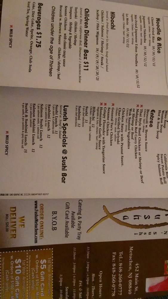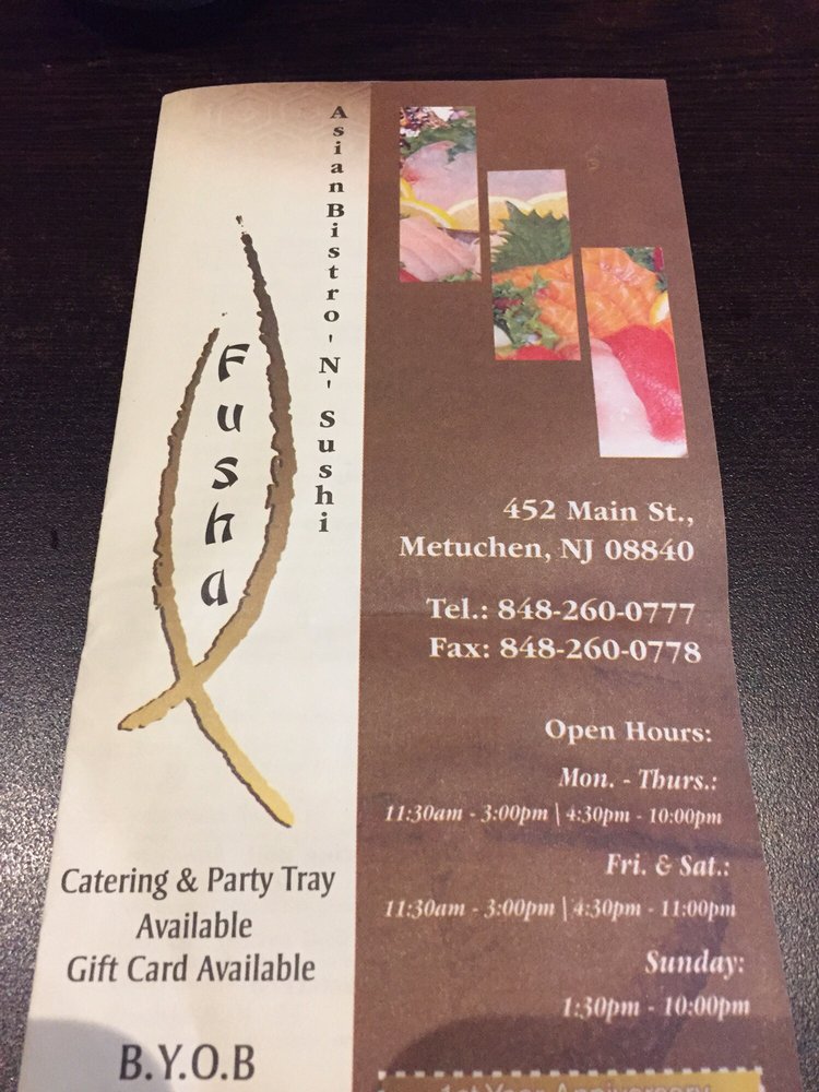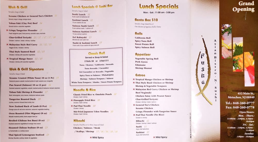 Introducing the menu at Fusha Asian Bistro, located in Metuchen, NJ, where the diverse Asian fusion cuisine shines. From appetizers like Edamame and Shumai to creative Sushi Bar Starters such as Tuna Wasabi Dumplings and Usuzukuri, there's something for every sushi lover. For soup enthusiasts, options like Miso Soup and Hot and Sour Soup are available. Customers rave about the Wok Signature Entrees and the fresh, flavorful dishes like the Thai basil stir-fry and Crispy Tangerine Flounder. Whether it's a quick lunch or a relaxing dinner, Fusha Asian Bistro offers a unique dining experience with excellent service and a welcoming ambiance. Dive into the world of Asian flavors and savor the delicious dishes that keep patrons coming back for more.