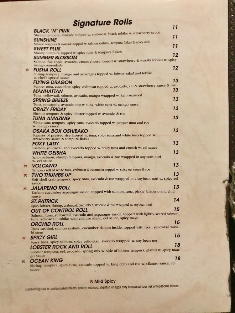 2 miso soup, 2 avocado salad, 2 spicy kani salad, 1 black "n" pink roll, 1 sweet plus roll, 1 fusha roll white geisha roll, st. Patrick roll, 1 spicy girl roll, 1 shrimp tempura roll, 1 California roll, 1 salmon tempura roll, 1 black tuna avocado roll, 1 spicy tuna roll, 1 spicy salmon roll and 1 spicy yellowtail roll.